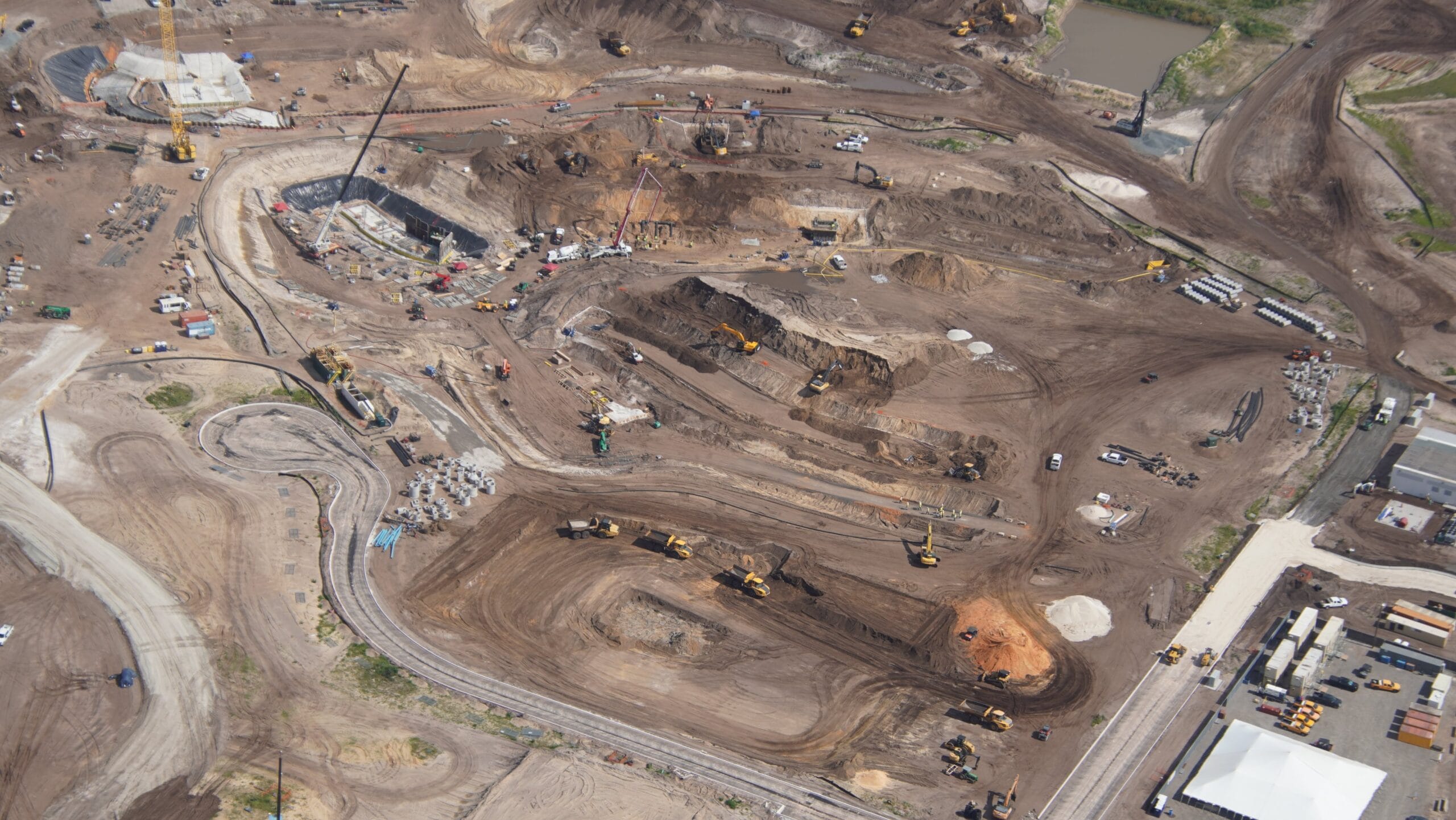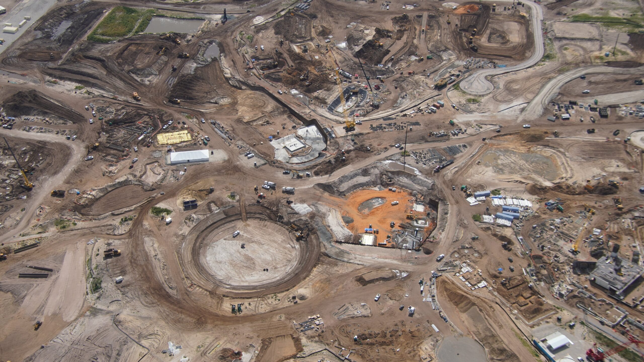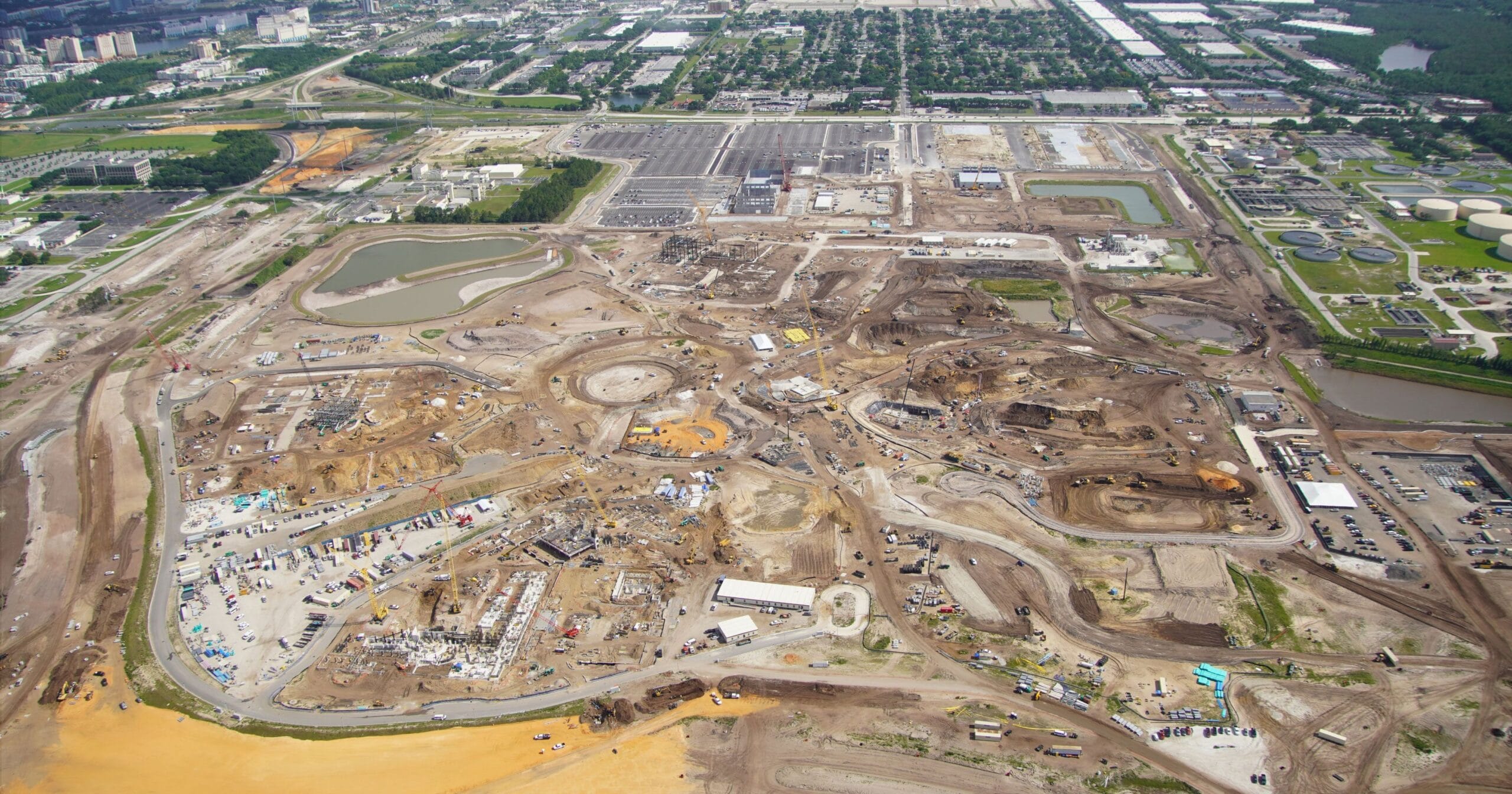 Bereits in der Übersicht vom Himmel aus ist klar ersichtlich, dass die Bauarbeiten für den Epic-Universe-Park auf Hochtouren laufen. Dank Tommy haben wir hier auch gleich eine gute Übersicht, wie die Baustellen-Aufnahmen interpretiert werden können. Diese basieren auf öffentlich zugänglichen Antragen, Entwässerungspläne, und natürlich Expertenvermutungen. Zur Orientierung: Der Eingang des Parks liegt rechts unten auf dem Bild, neben dem offiziellen Epic-Universe-Logo.