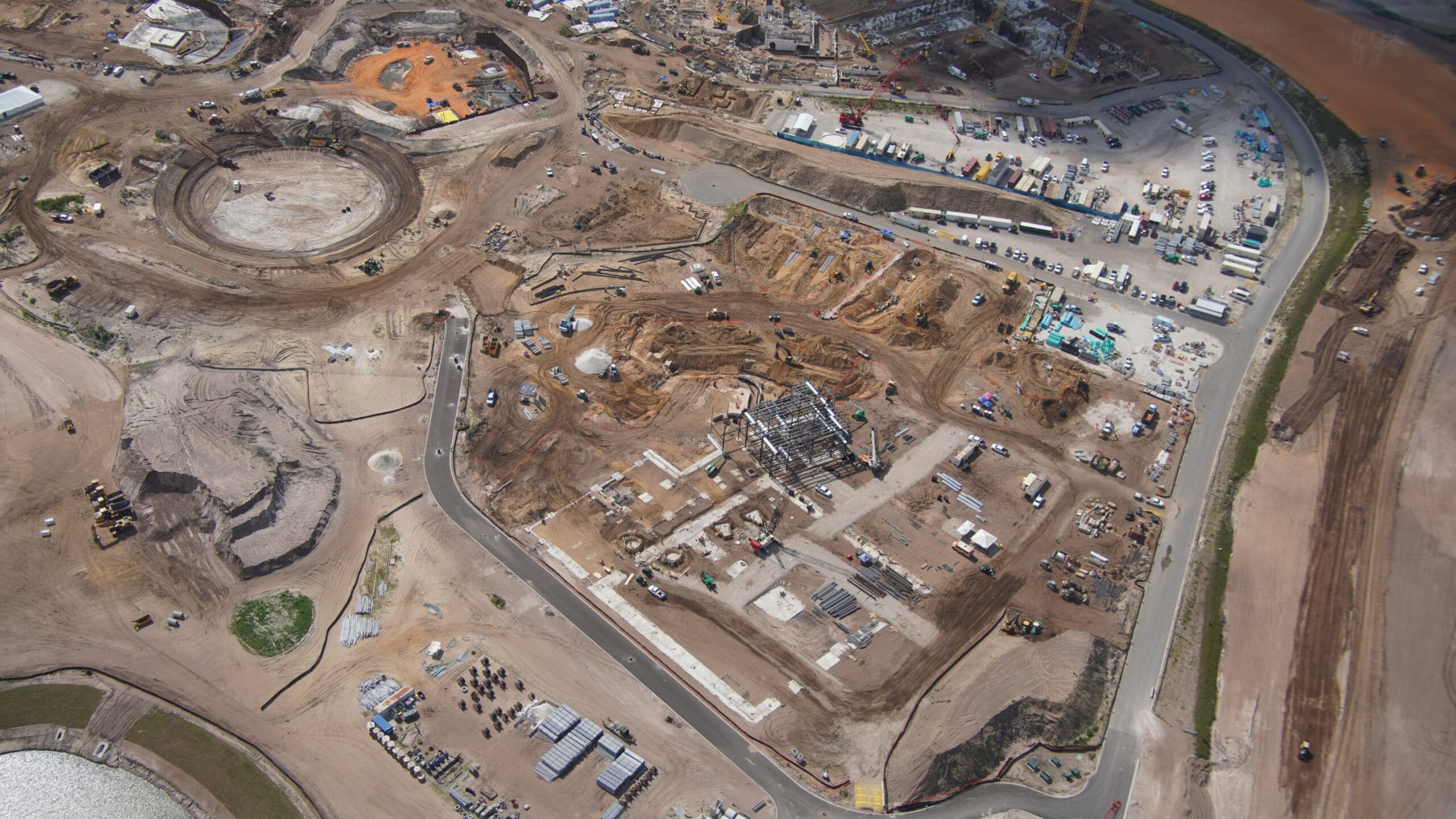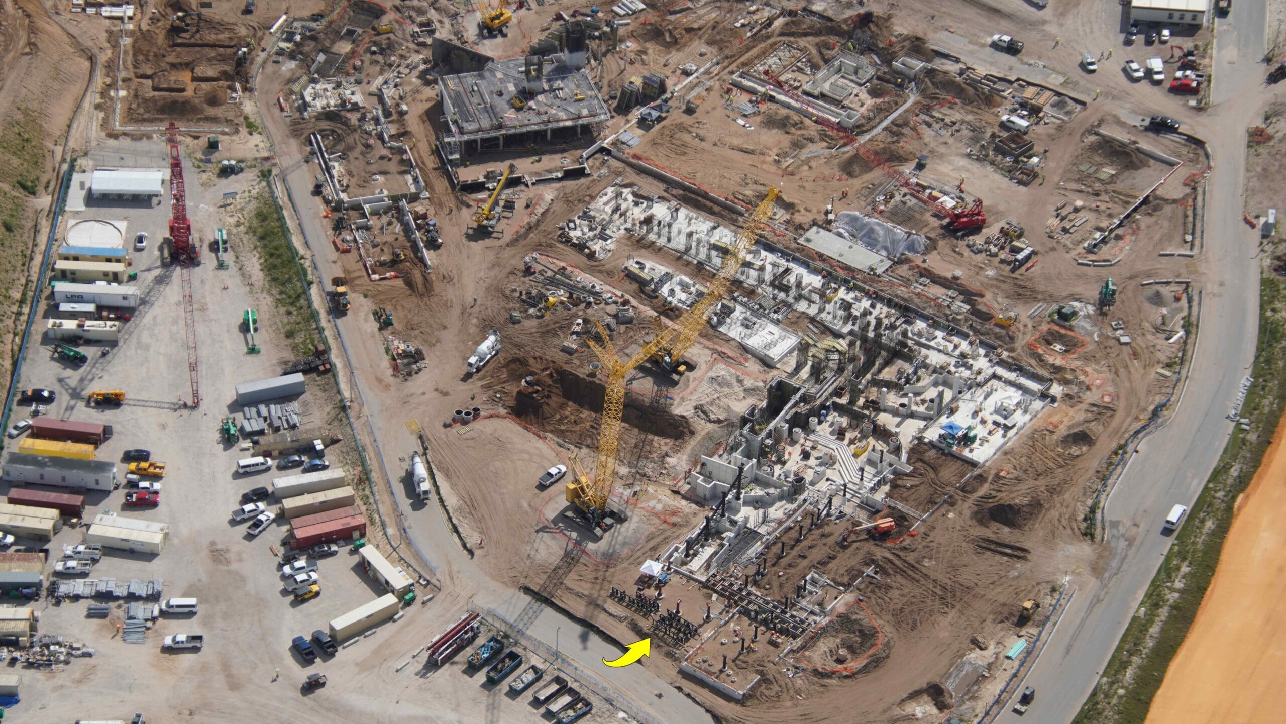 Auch im hinteren Teil des Parks geht es in die Höhe: Für die Attraktionen, die im neuen Harry-Potter-Bereich vermutete wird und im Zaubereiministerium spielen soll stehen die ersten Gerüste des Gebäudes. Hier sieht man einen Überblick über die Arbeiten am Ministry of Magic in Universal’s Epic Universe aus der Vogelperspektive (ausserdem: oben in der Mitte ist das kreisförmige Becken zu sehen, das sich beim Hotel befinden wird).