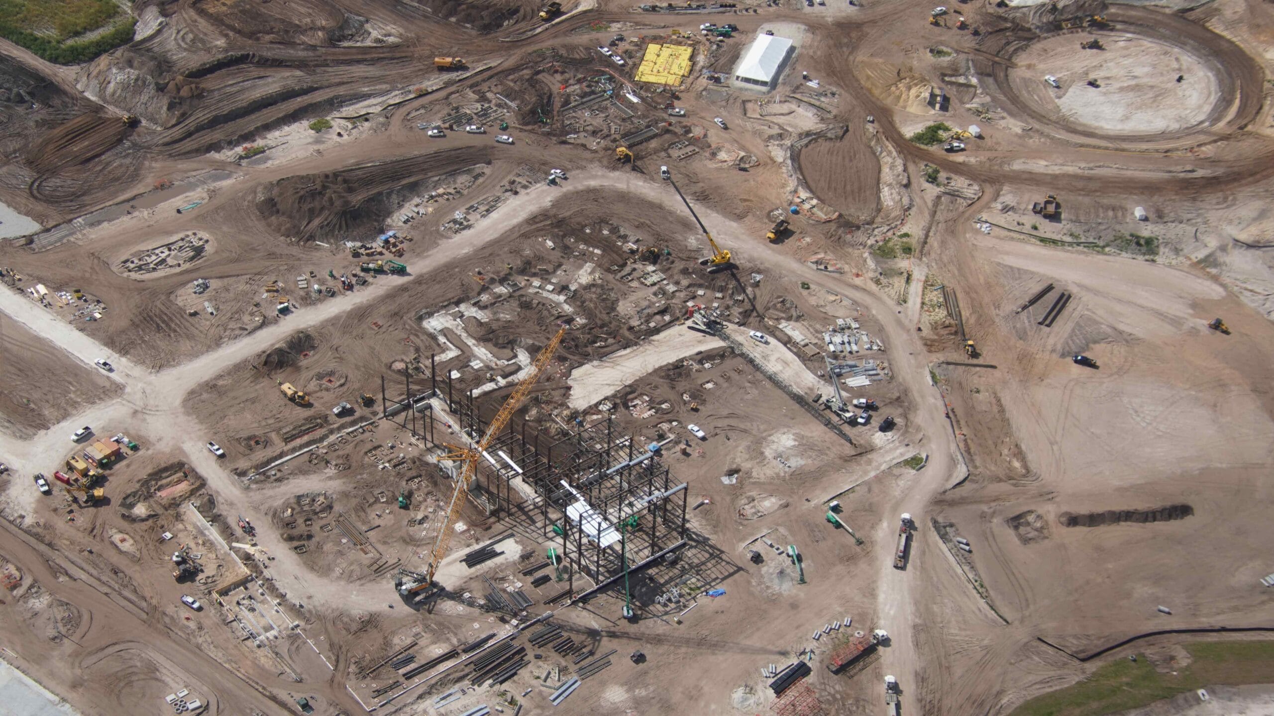Zur etwas näher aufgenommenen Übersicht unten: Der Kreis in der Nähe der Mitte dieses Luftbildes ist das Brunnenbecken, das sich vor dem Parkhotel von Epic Universe befinden wird. In der Nähe befinden sich Aushubarbeiten für ein neuartiges Indoor-Karussell und den dazugehörigen Teich. Oben ist das How To Train Your Dragon-Land zu sehen. Rechts die vorderen Bereiche des Classic Monsters-Bereich.