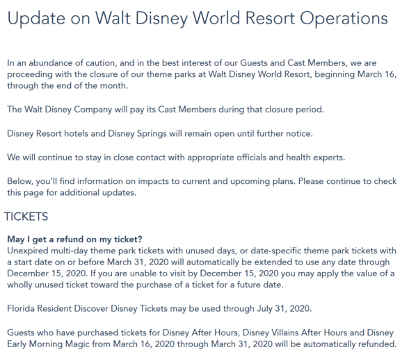 Update: Auch die Hotels und die von Disney geführten Restaurants und Shops in Disney Springs werden geschlossen (Screenshot, Übersetzung darunter):