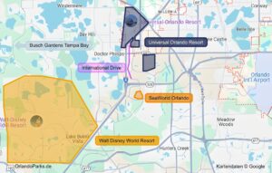 Auf der Karte rechts seht ihr, wo die Parks zu finden sind – beider Wahl des richtigen Hotels in Orlando unverzichtbar: