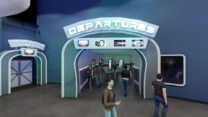 Im „Gateway: The Deep Space Launch Complex“ können Besucher echte gebrauchte und nachgebaute Raumfahrzeuge aus nächster Nähe betrachten und sich auf eine eigene simulierte Weltraumreise begeben. Im Inneren des Gateway-Gebäudes schwebt ein gebrauchter SpaceX Falcon 9 Booster in der Luft. Dieser Booster mit seinen Brandspuren hat zwei Falcon-Missionen unterstützt, bevor er in das neue Attraktionsgebäude einzog.