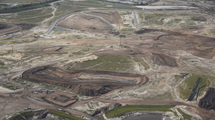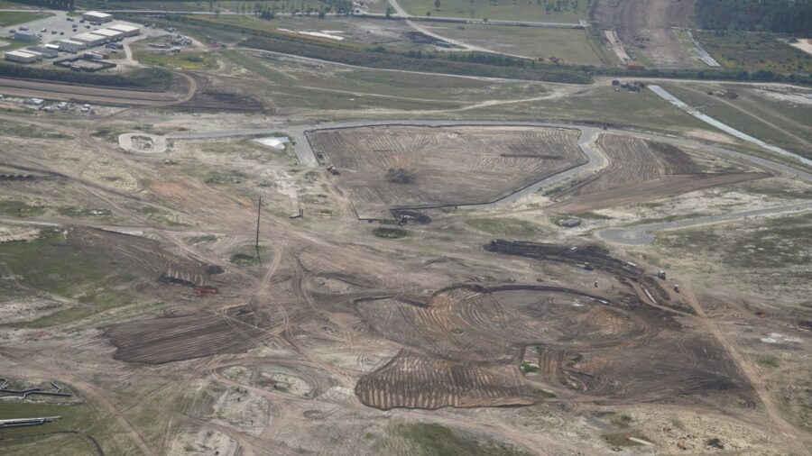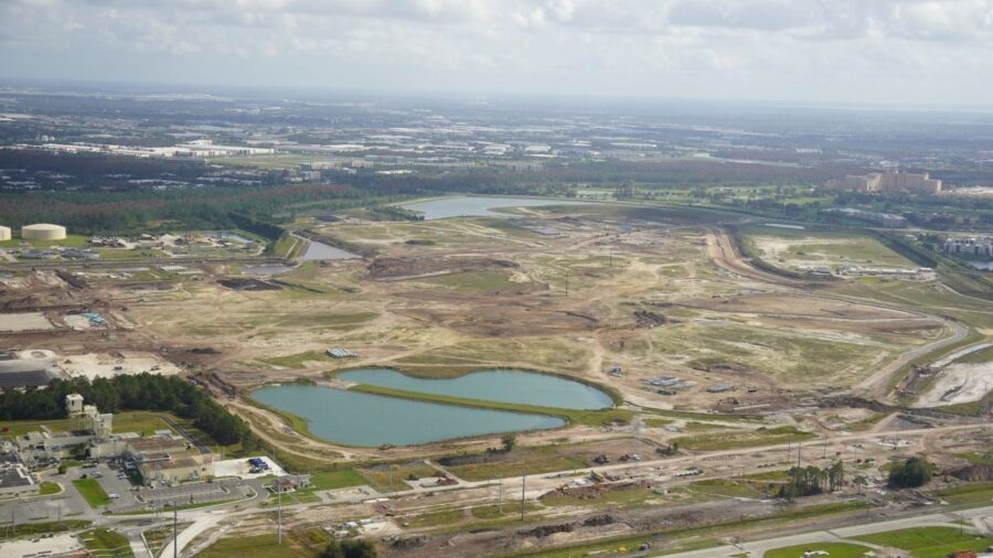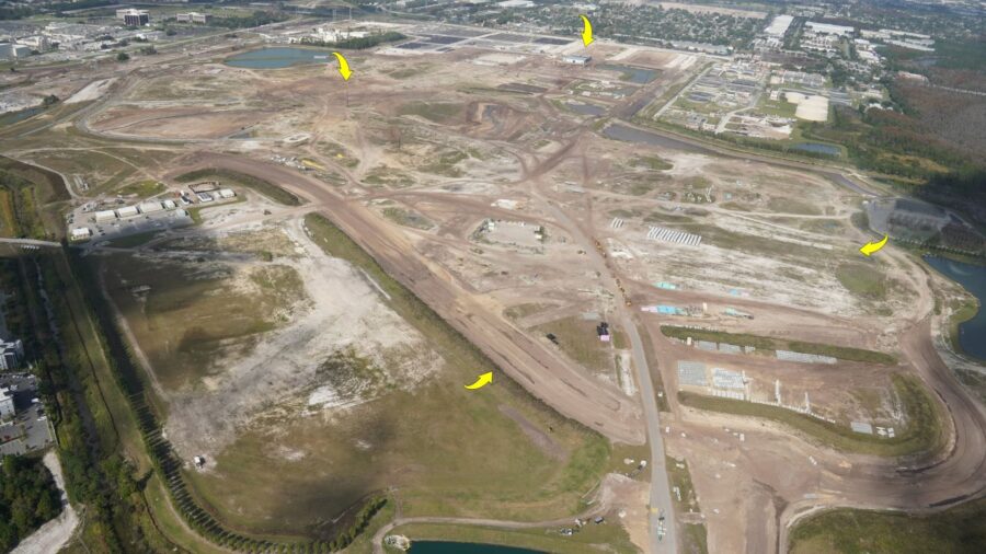 Luftaufnahme von Universal’s Epic Universe. In der Mitte des Bildes sind grosse Aushubarbeiten zu sehen, auf denen der eigentliche Themenpark entstehen wird. Der hohe Pfosten im Zentrum wird etwa die Mitte des Parks sein. Die Kirkman Road wird am unteren Bildrand weitergeführt werden. Rechts ist ein Strassenverlauf zu sehen, das zu den Parkplätzen führen wird. Aufnahme wurde etwa hier gemacht.