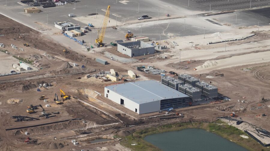 Luftaufnahme der ersten beiden Gebäude von Universal’s Epic Universe. Die Kaltwasseranlage im Vordergrund ist eine zentrale Klimaanlage für den Themenpark. Dahinter wird ein weiteres Lagerhaus errichtet.
